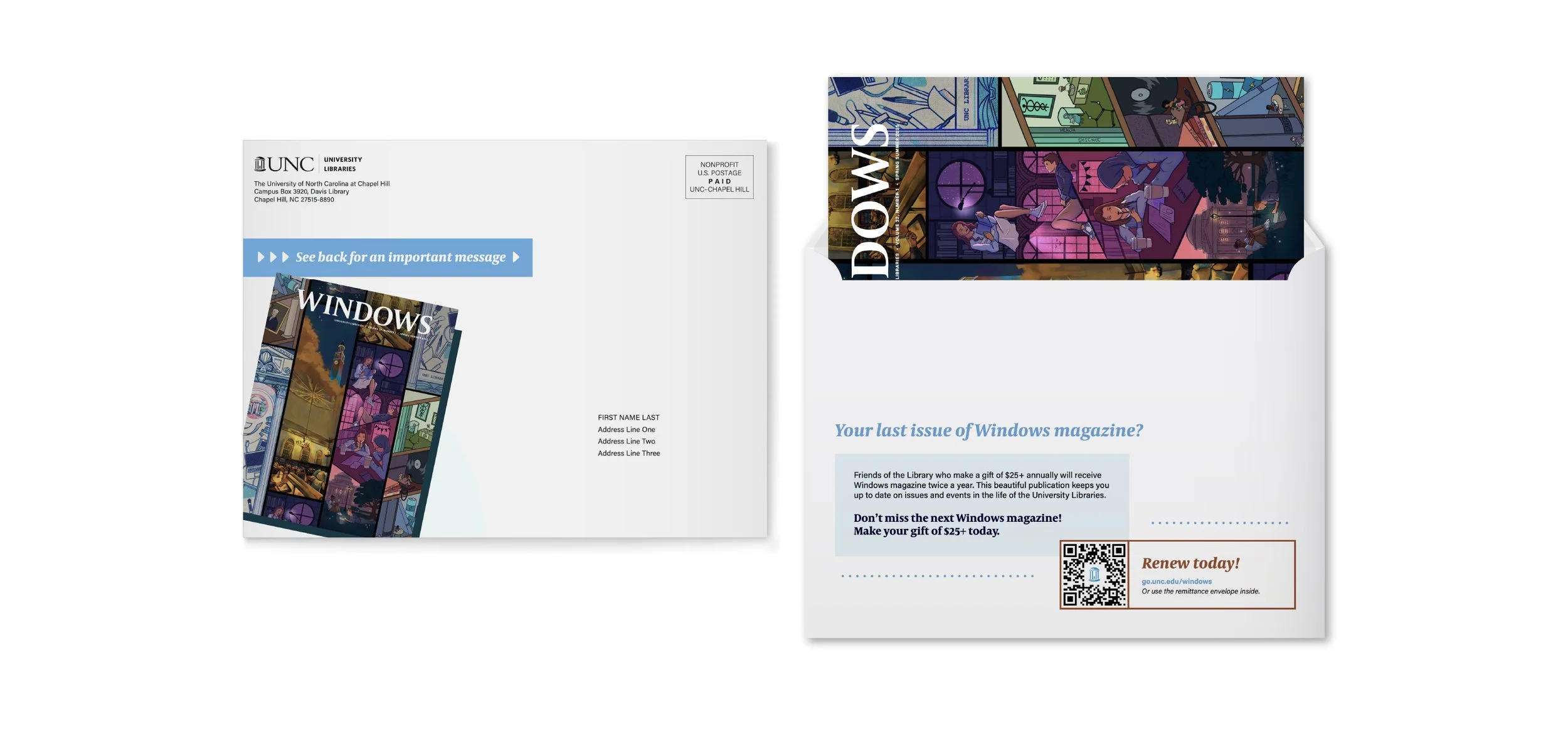 Windows magazine is a bi-annual publication by the University Library at UNC-Chapel Hill. As the art director and designer for Windows magazine, I translated editorial content into cohesive visual stories across print and digital. The magazine’s goal is to engage Friends of the Library and cultivate relationships through impactful visual and written storytelling.